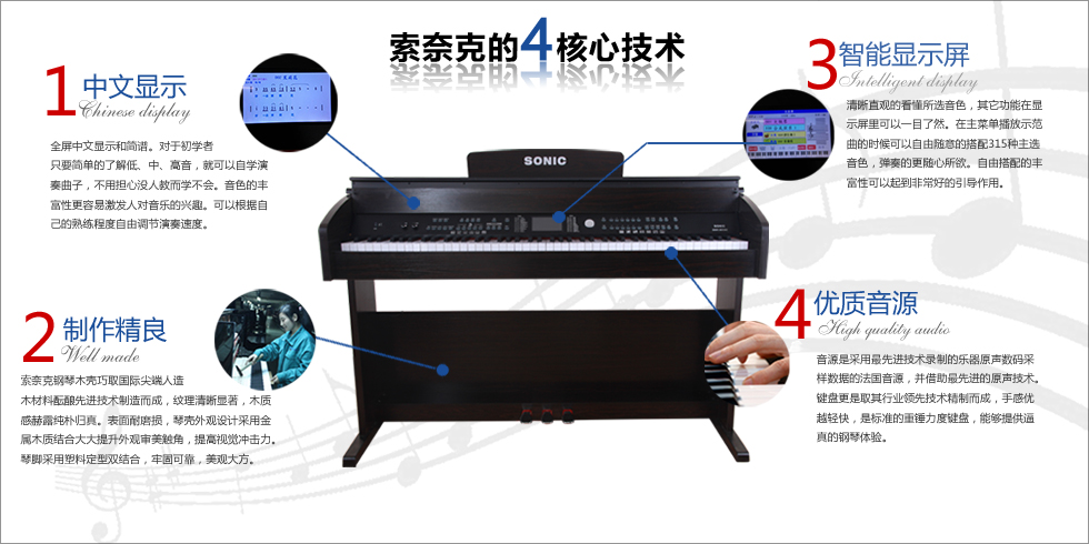 中山市小欖鎮(zhèn)名樂(lè)電子有限公司是一家專(zhuān)業(yè)從事電子樂(lè)器產(chǎn)品研發(fā)、生產(chǎn)、銷(xiāo)售服務(wù)于一體的高新技術(shù)企業(yè)。已獲得相關(guān)產(chǎn)品的3C、CE、CB等認(rèn)證。主要生產(chǎn)經(jīng)營(yíng)品牌索奈克(Sonic)電鋼琴和電子琴等。